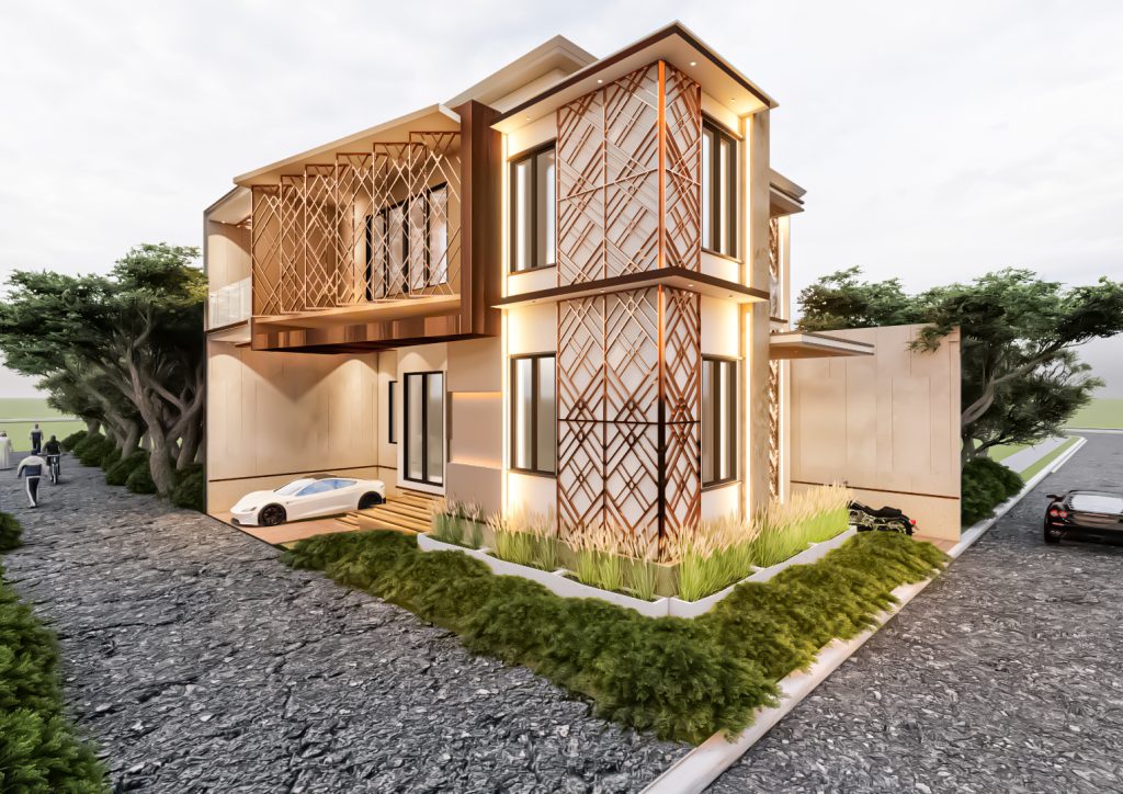 Desain Rumah 2 Lantai Ibu V, Bekasic. Desain > 200 M2, Desain Favorit DESAIN RUMAH IBU. V – BEKASI – LUAS 210/120 M2 – RUMAH 2 LANTAI – GAYA MODERN KONTEMPORER CARPORT; R. TAMU; R. KELUARGA; R. MAKAN; R. KERJA; DAPUR; 4 KAMAR TIDUR; 3 KAMAR MANDI; TAMAN BELAKANG; BALKON; AREA JEMUR;
